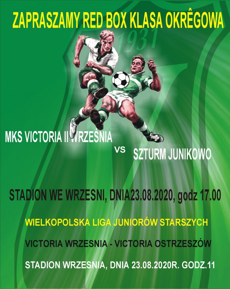 Zarząd MKS Victoria Września. Wielkopolska Liga Juniorów Młodszych 2020-08-29Juniorzy młodsi Victorii Września pod opieką trenera Roberta Bobkiewicza w okresie przygotowawczym rozegrali 5 spotkań kontrolnych z: MKS Mieszko Gniezno (3:2), SMS Włocławek (2:7), SKP Słupca (4:0), Polonia Środa Wlkp (3:2), Sokół Kleczew 3:3. W tym sezonie rozgrywkowym będą rywalizowali w grupie 1 z takimi przeciwnikami jak: Poznańska 13, Mieszko Gniezno, AP Reissa Poznań, SF Luboń, Koziołek Poznań, Unia Swarzędz, Polonia Poznań, SPN Szamotuły oraz Błękitni Wronki. W dniu dzisiejszym przystąpili do rozgrywek i rozegrali pierwszy mecz mistrzowski z Akademią Piłkarską Reissa Poznań. Po bramce Wiktora Kaczmarka w 9 minucie pokonali przyjezdnych 1:0. Victoria wystąpiła w składzie: Antkowiak, Pruchnik, Focht, Wysocki, Skrzypczak, Małek, Strzelczyk, Czajczyński, Pokładecki, Gonet, Kaczmarek, Szambelańczyk, Ciesielski, Dębicki, Szkudlarek, Kołodziejczak, Gajownik, Szarzyński. Kolejny mecz mistrzowski również na własnym stadionie za tydzień w niedzielę o godz. 13.30 a przeciwnikiem będzie Unia Swarzędz.