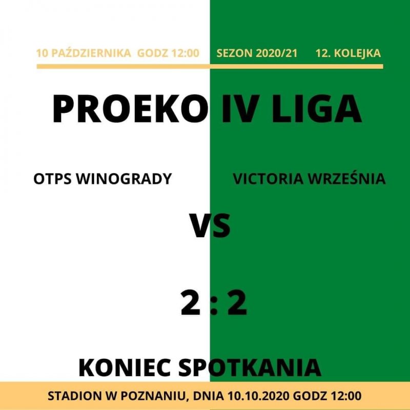 https://www.gov.pl/…/regionalne-obostrzenia-dla-wybranych-p… Autor: Janusz Hofman ![]() W związku z sytuacją w kraju i w regionie zarząd klubu zdecydował, że sobotni mecz seniorów z Victorią Września odbędzie się bez udziału kibiców. W obecnej sytuacji moglibyśmy wpuścić jedynie około 30 osób, a większości kibiców musielibyśmy odmówić wstępu. Mając na uwadze zdrowie naszych kibicek i kibiców uznaliśmy że zamknięcie stadionu na najbliższe spotkanie jest jedynym sensownym rozwiązaniem. Obserwujemy na bieżąco sytuację i będziemy informować na bieżąco o decyzjach na kolejne mecze rozgrywane na naszym boisku.Jednocześnie informujemy że czynimy starania aby przeprowadzić relację z sobotniego meczu na profilu facebookowym naszego klubu.Autor: Janusz Hofman Czas na Winogrady 2020-10-06Już w najbliższą sobotę w Poznaniu zespół trenera Bekasa rozegra 12 serię spotkań o Mistrzostwo PROEKO IV ligi. Rywalem naszej drużyny będzie zespół OTPS Winogrady Poznań. Początek spotkania godz.12.00. Zapraszamy !!!Autor: Janusz Hofman