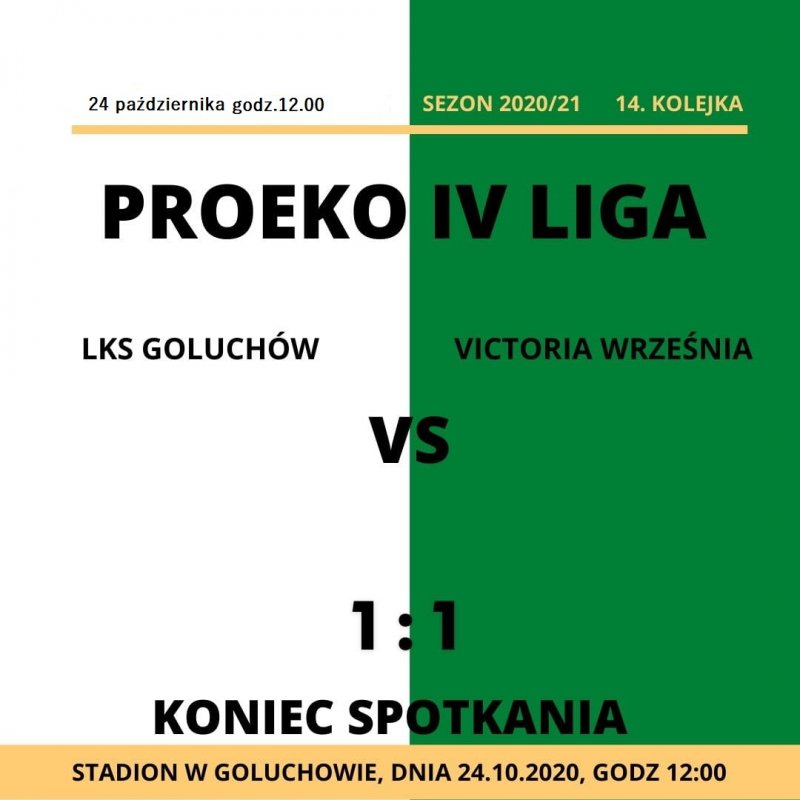 Autor: Janusz Hofman Remis w Gołuchowie 2020-10-24Sobotni pojedynek w samo południe w Gołuchowie zakończył się podziałem punktów 1:1. Nasza drużyna po stracie bramki w 12 minucie dążyła do zdobycia gola wyrównującego. Sztuka ta udała się w 77 minucie za sprawą Mikołaja Panowicza. Na bramkę dającą 3 punkty w tym spotkaniu zabrakło już czasu.